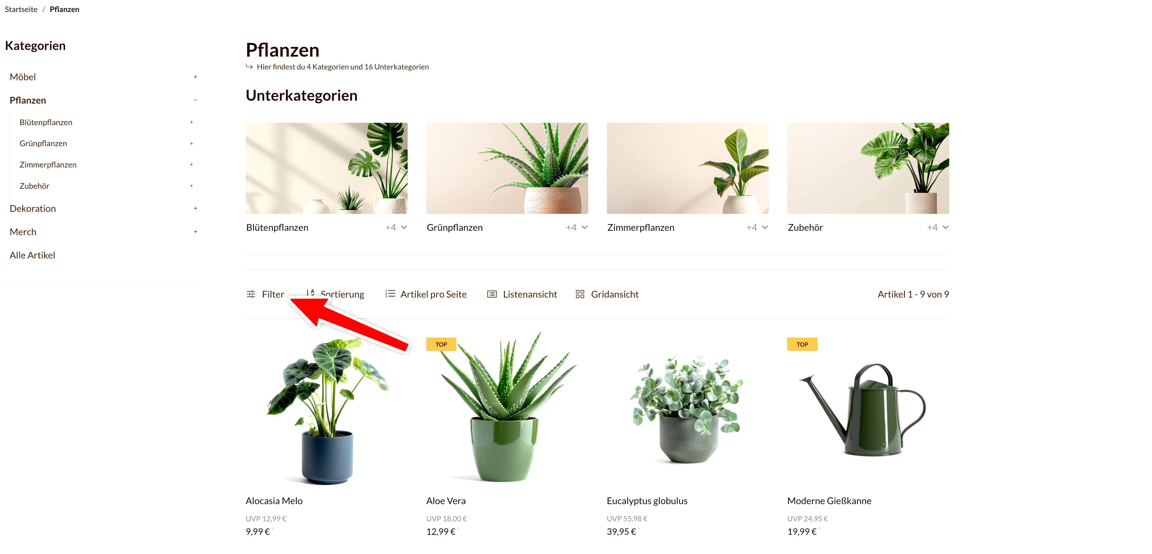 Lege fest, wo die Filter auf Mobil & Tablet positioniert werden sollen. Auswahl zwischen Sidebar und Über Produktübersicht.Produkte auch in Oberkategorien darstellen [BETA]