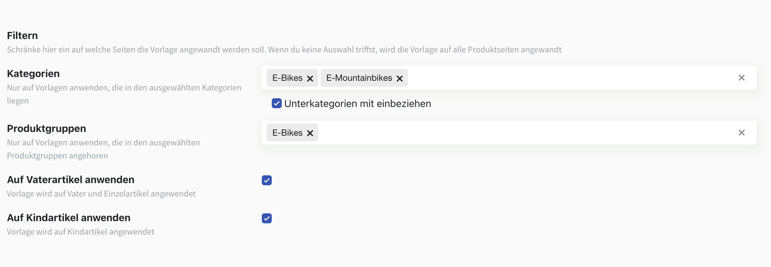 Wähle hier auf welche Kategorien sich das Template beschränken soll. Für Produkte: Nur Produkte der ausgewählten Kategorien erben das Template. Wenn du die Option aktivierst Unterkategorien mit einbeziehen, findet das Template auch auf Produkte Anwendung, die in Unterkategorien liegen. Für die Anwendung muss das Produkt in mindestens einer der Kategorien liegen. Für Kategorien: Du kannst hier einzelne Kategorien und, je nach Einstellung, ihre Unterkategorien auswählen auf die das Template Anwendung finden soll.Wähle nichts aus, damit alle Kategorien Anwendung finden.
