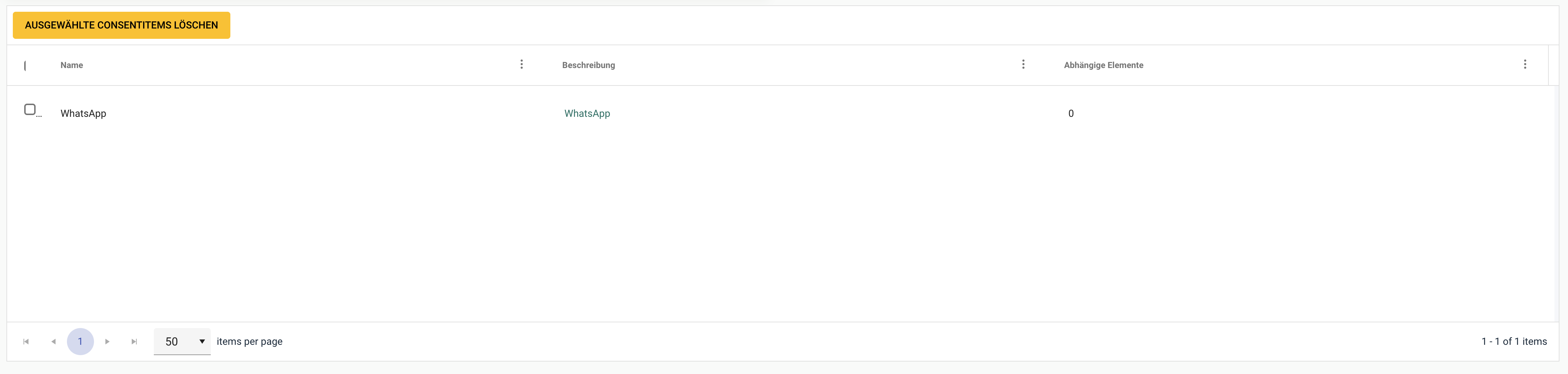 Hier findest du eine Übersicht zu allen angelegten Consent-Items:
