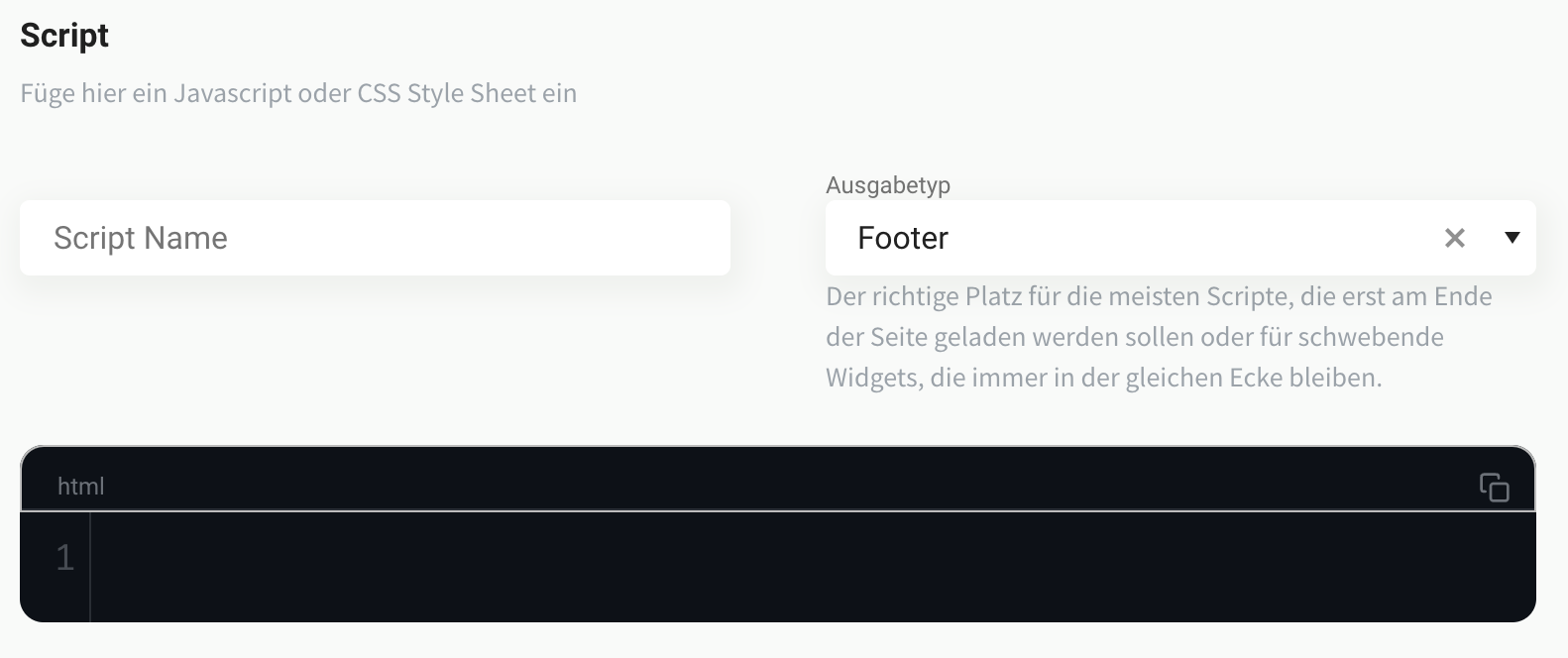 Vergebe hier einen eindeutigen Namen für das Script, z.B. “Google Analytics Tracking” oder “Facebook Pixel”.