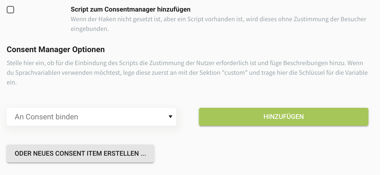 Setze den Haken bei “Script zum Consent Manager hinzufügen”, wenn das Script erst nach Nutzer-Zustimmung geladen werden soll.